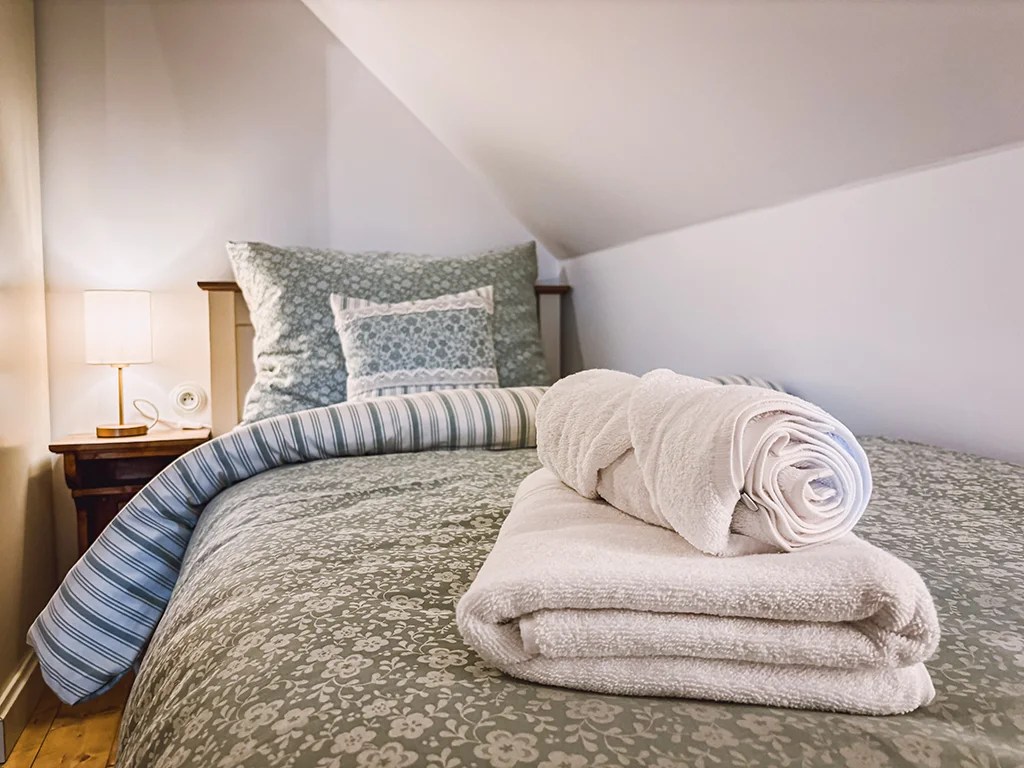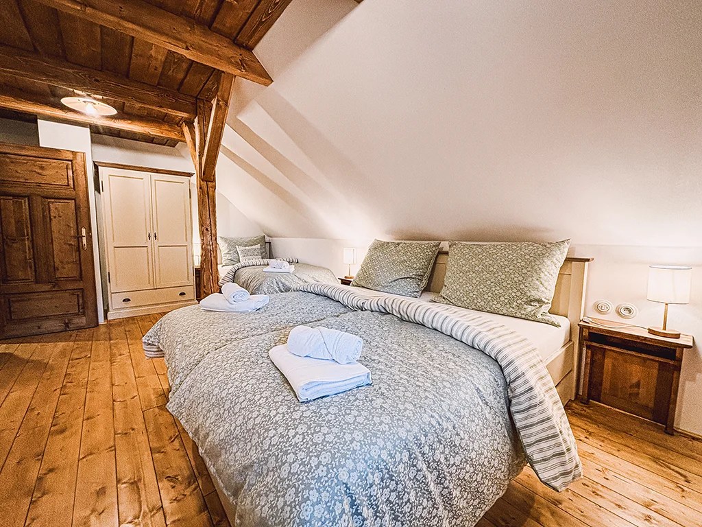 Ve druhém podlaží se nacházejí čtyři prostorné ložnice, z nichž dvě mají přístup na podkrovní hambálky, kde se vyspí až šest osob. Všechny postele jsou opatřeny kvalitními pružinovými matracemi and kanafasovým povlečením české výroby, aby byla zajištěna maximální pohoda a komfort. Patro disponuje také samostatným WC and prostornou koupelnou se sprchovým koutem.